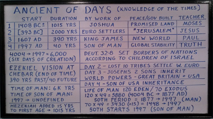 'Ancient of Days' is a biblical idiom for 'knowledge of the times,' which is found in the integration of history and Scripture, and shows how our time and our behavior function interactively. The white board below charts some of the basic tenets of this knowledge.